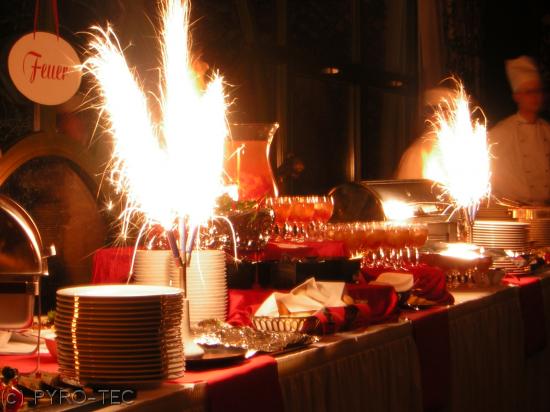 Per Fernzündung wird zur Buffeteröffnung ein Feuerwerk in Form von gefächerten und senkrechten Silberfontänen, farbigen Flammen und roten Bengalfeuer gezündet. Eine preisgünstige Zündanlage zum kaufen oder zum mieten steht zur Verfügung.
