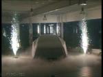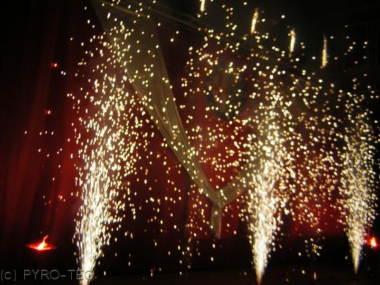 brennenden Feuerschalen, Flammensäulen, Fontänenwänden, Funkenblitzen und einem Wasserfall.