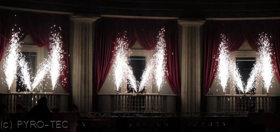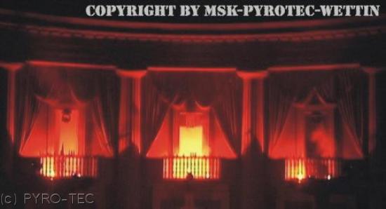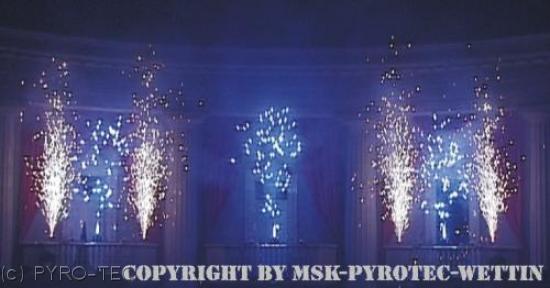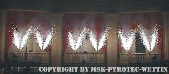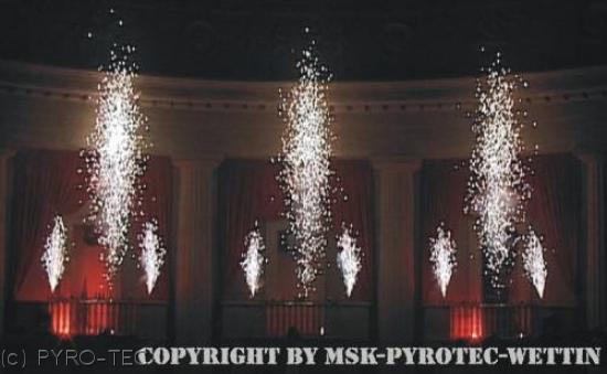 Ein phantastischer Farbenzauber aus Funken und Flammen. Extra für den Bühnen- und Studiobereich (innen und außen) entwickelte und gesetzlich zugelassene, raucharme Effekte, wie z.B. Blitze, Sonnen, Wasserfälle, Feuerschriften, Feuertöpfe, Fontänen (in allen Variationen), Flammensäulen, Flammenschalen und viele andere neue Effekte.